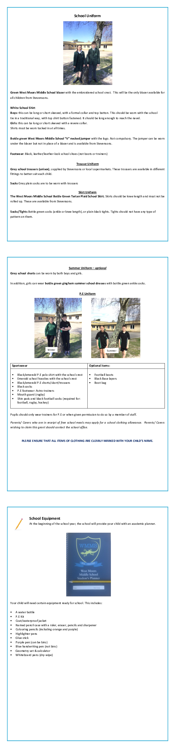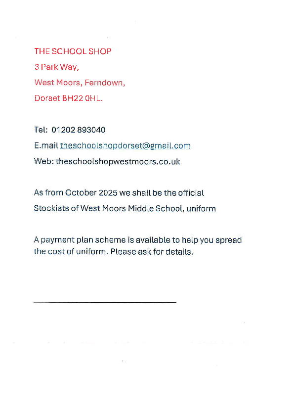 Uniform is a statement of pride in the school, a statement of belonging and a personal commitment by the individual to the school. Our school uniform is designed to present a positive image of our school to both our local community in West Moors and beyond. Parents can purchase items from the recommended school suppliers and standard items can be bought from local supermarkets.