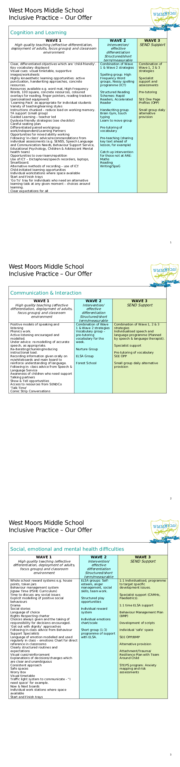 West Moors Middle School’s offer for inclusion was developed collaboratively by the whole staff team. Together, we agree that the provision detailed in this document is a strong offer of inclusive support to ensure the overall wellbeing and achievement of all in our community. We will use this provision map to record and review individual packages of support for all who benefit a more bespoke programme of scaffolding to access learning, the school environment and to support their overall wellbeing and development. It will also be used to support the thinking behind the development of a package of support for those with more complex needs. This can then also be used to demonstrate/evidence a graduated response to Special Educational Needs and Disabilities (SEND) in line with the Code of Practice (2014). Staff will share these maps of provision with parents and students at any appropriate point but always during Parent Consultations. Copies will be sent home for reference. Parents and students should be involved in the development of provision and thinking about what could be supportive to promote learning in all areas. Students, parents and staff will be involved together to collaboratively develop and agree programmes of support. A student-centred approach will be facilitated by the school at all times.
