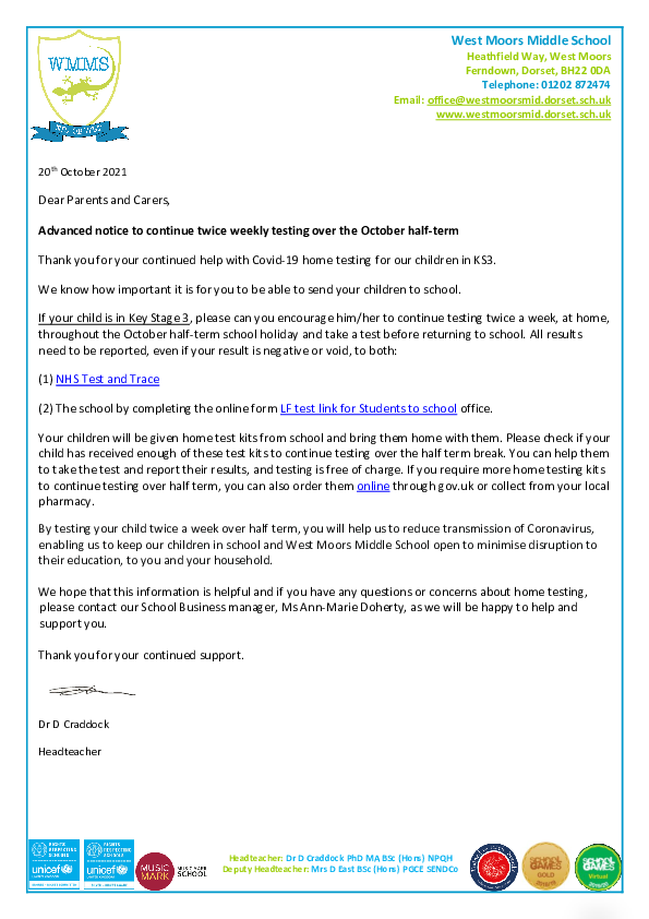 Advance notice LFTs over half term 20.10.21