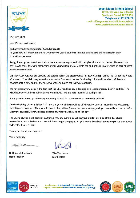End of Term Arrangements for Year 8 Students