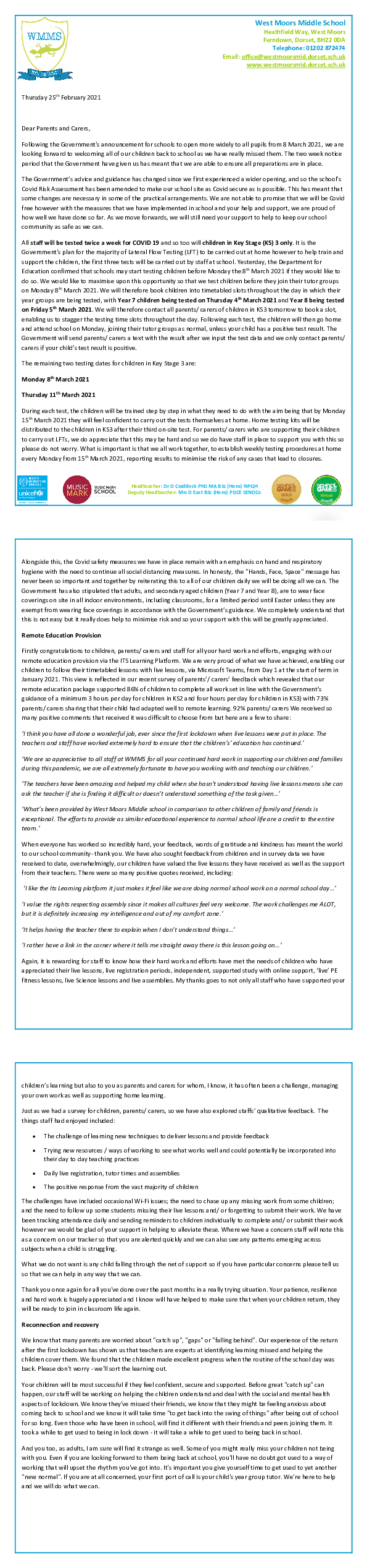Letter to parents and carers 25th February 2021 - re-opening plans