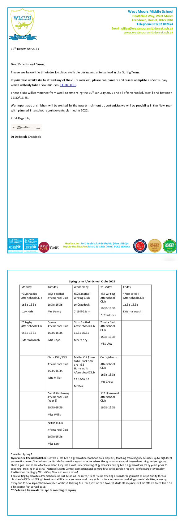 Letter to Parents and Carers- Enrichment Clubs for the New Year (Spring Term)