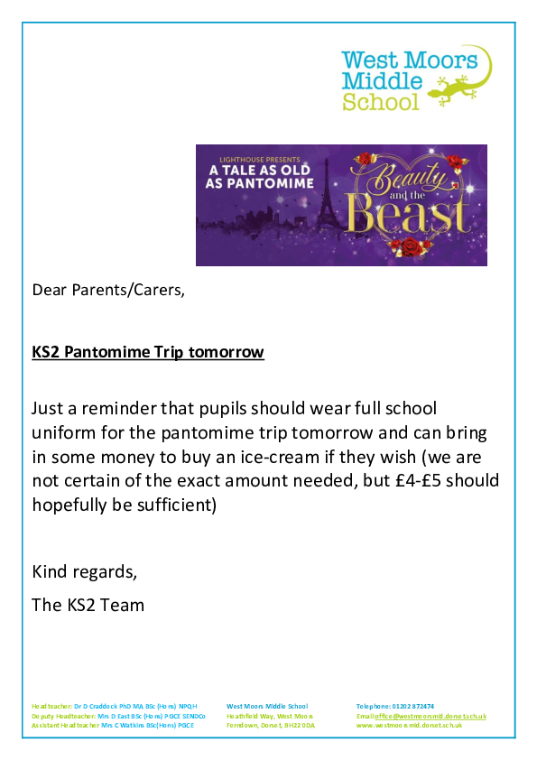 Letter to Parents and Carers- KS2 Pantomime