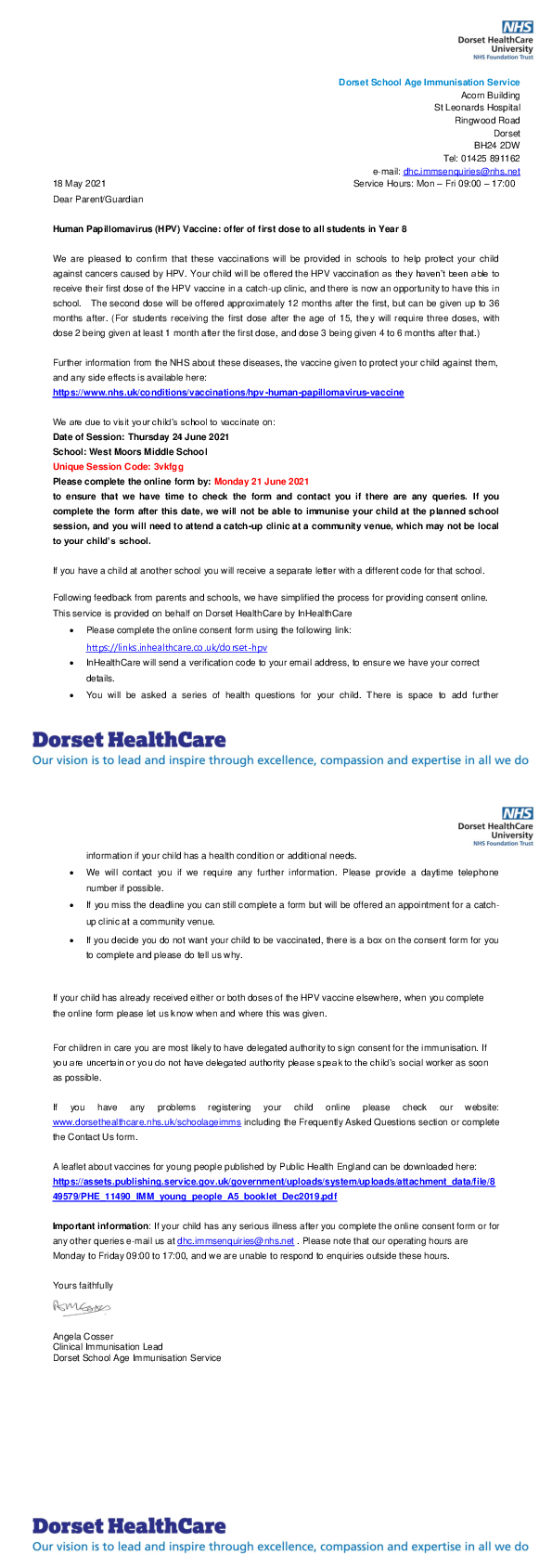 Letter to parents -HPV vaccination