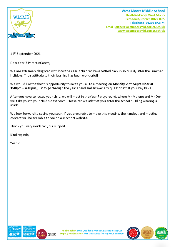 Letter to Year 7 Parents 14.09.21