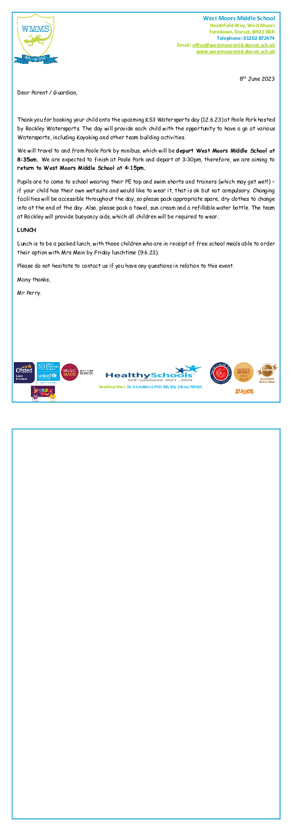Rockley Trip - Letter to parents