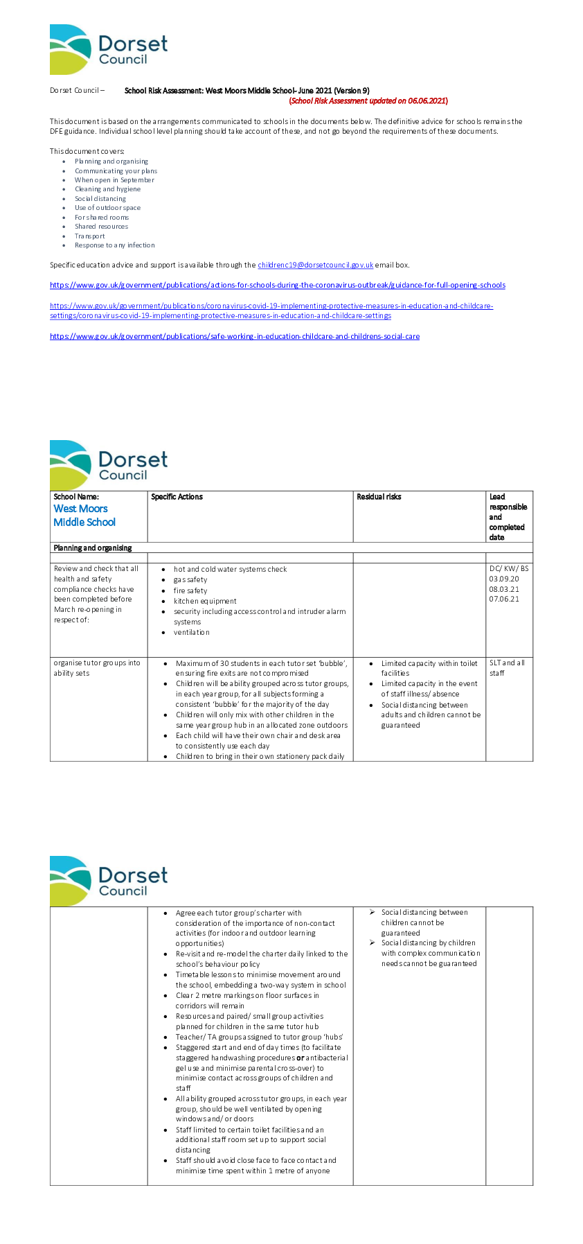 Updated Covid Risk Assessment for West Moors Middle School June 2021