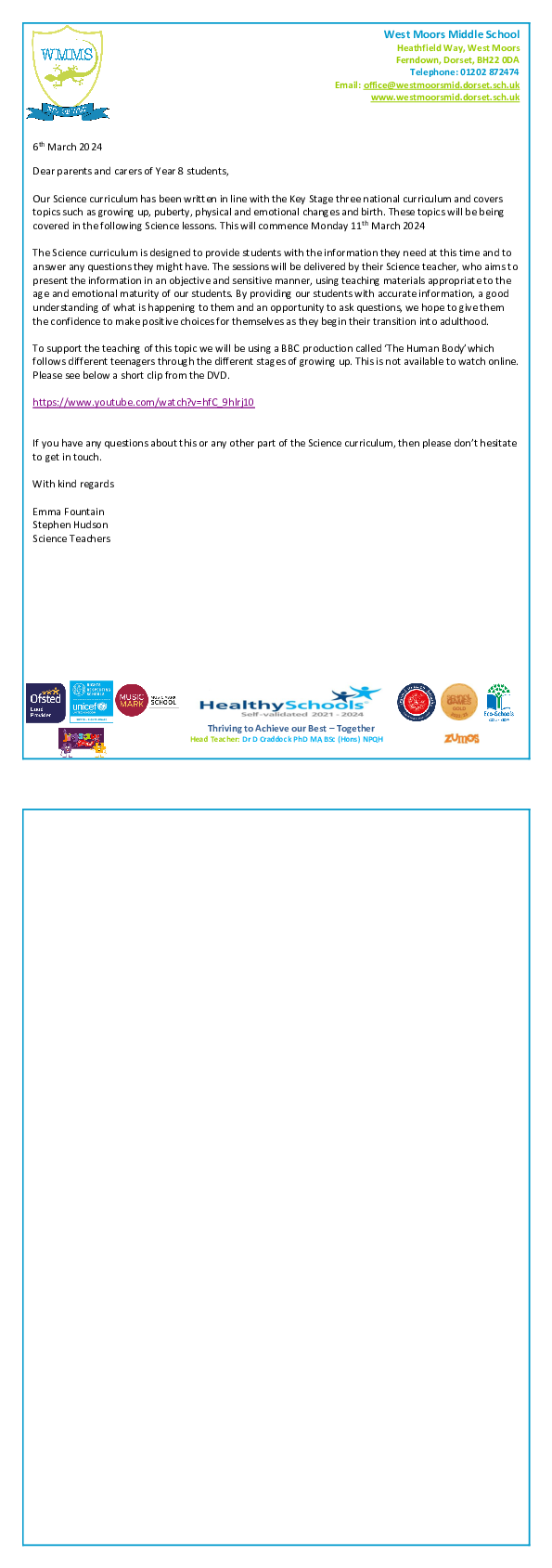 Y8 Sex education letter to parents 6.03.2024