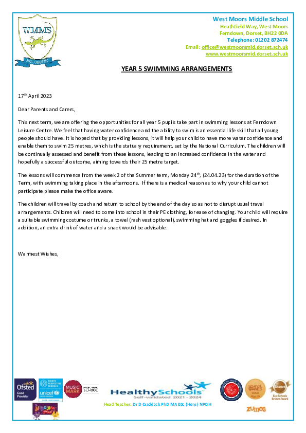Year 5 Swimming Letter 17.4.23